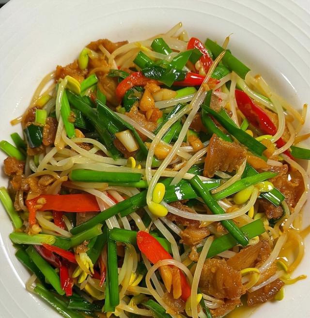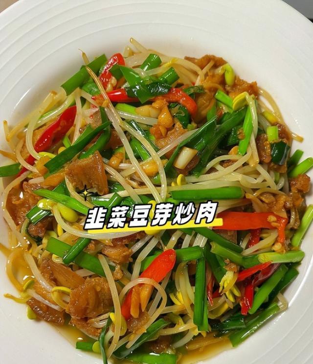五花肉200克、豆芽200克、韭菜100克、葱1根、姜1块、蒜3瓣、生抽2勺、老抽半勺、料酒1勺、盐适量、食用油适量。