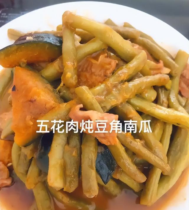 五花肉150克、豇豆200克、南瓜200克、八角1个、桂皮1小块、葱1根、姜1块、生抽2勺、盐适量、食用油适量。