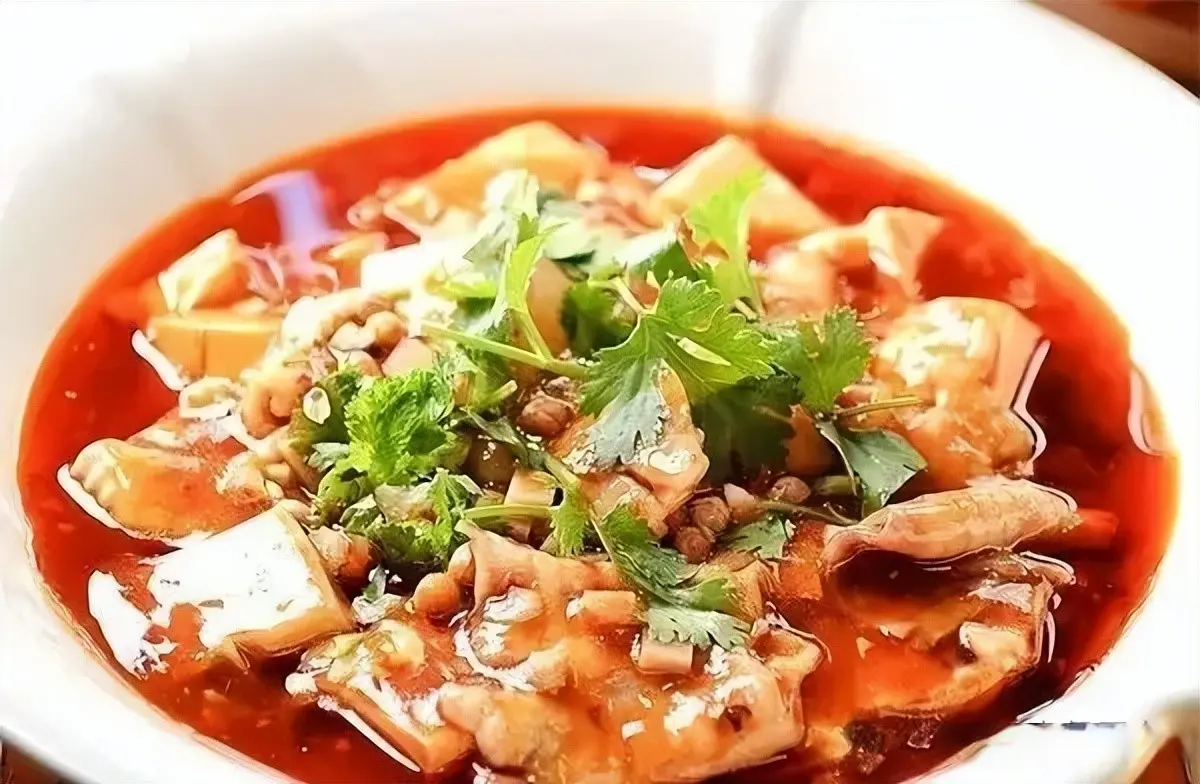乌鱼片200克内脂豆腐2盒大头菜粒20克酥黄豆颗10克酥花仁粒10克馓子碎粒10克蛋清豆粉、豆瓣酱、自制二荆条辣椒粉、姜米、香葱花、香菜、盐、胡椒粉、保宁醋、白糖、味精、水淀粉、鲜汤、鸡油、菜油各适量