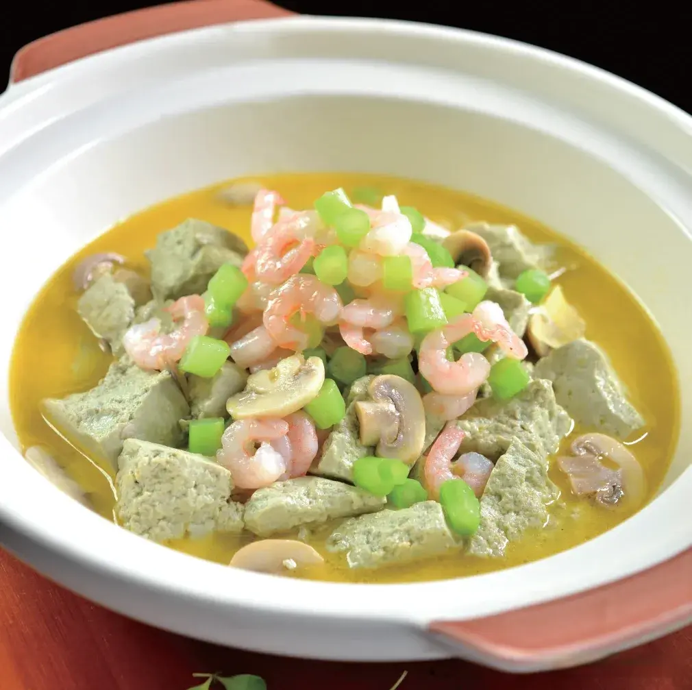 黑豆花600克、口蘑80克、青虾仁100克、菜心粒50克、金瓜汁100克、姜片5克、蒜片3克、盐3克、味精2克、鸡精2克、化鸡油20克、鲜汤适量