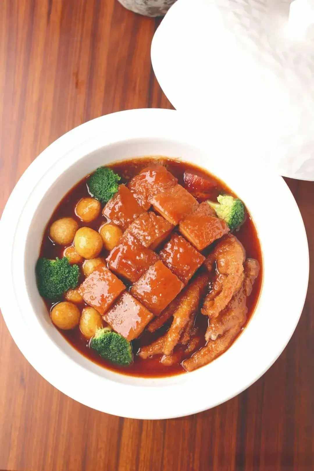 3.锅留底油,下入姜片、葱节爆香,掺入鲜汤烧沸,下 入炸过的五花肉块、鸡爪块、鹌鹑蛋和杏鲍菇片,调入盐、 料酒、味精、鸡精、糖色,转文火煲至软糯入味,待自然收 浓汤汁后,出锅装入钵内保温,摆放上熟西蓝花朵,即成。