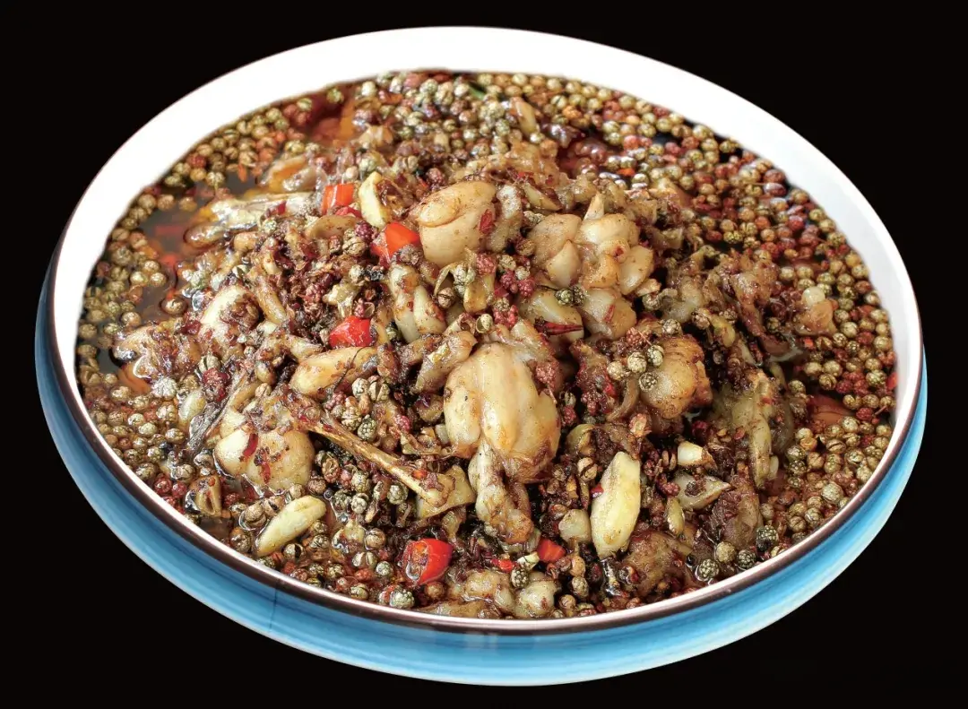 3、净锅入色拉油烧至160℃,下花椒炒香,起锅淋蛙肉上,撒上葱花即可。