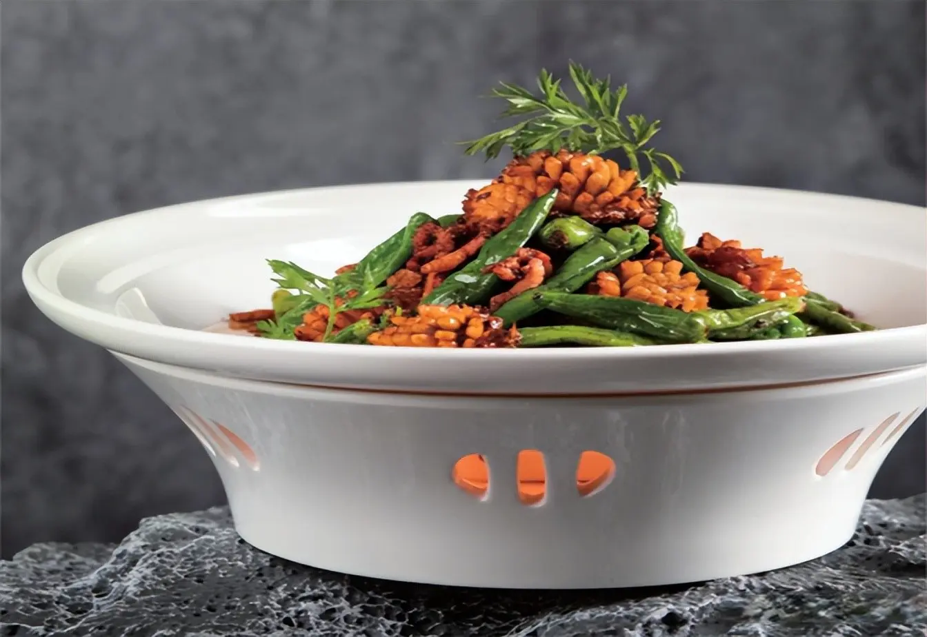 2.锅入油,下肉丝小火煸炒出油,加姜米、蒜米炒香,下鲍鱼,调入盐,舀入浓汤,收汁后起锅倒入码碗。净锅下入樟树港辣椒,加盐稍煸炒,起锅备用。