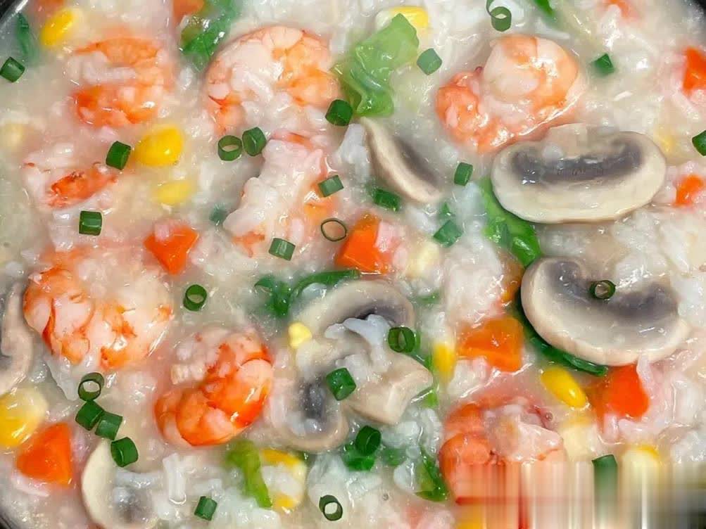 5.煮至大米开花后,倒入口蘑、胡萝卜丁和玉米一起炖煮五分钟,记得不断搅拌,防止粘锅,再加入腌制好的虾仁煮三分钟,最后倒入生菜碎,加入适量的食盐、香油和白胡椒粉调味,继续搅拌均匀,再撒入一把葱花点缀,即可出锅开吃。