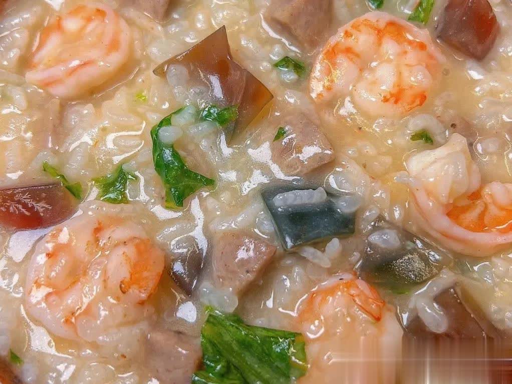 4.大米煮开后,再加入香肠丁和皮蛋一起炖煮五分钟,然后倒入腌制好的虾仁炖煮,再炖煮三分钟左右后,撒入生菜碎,加入适量的食盐和香油调味提鲜,即可出锅开吃。