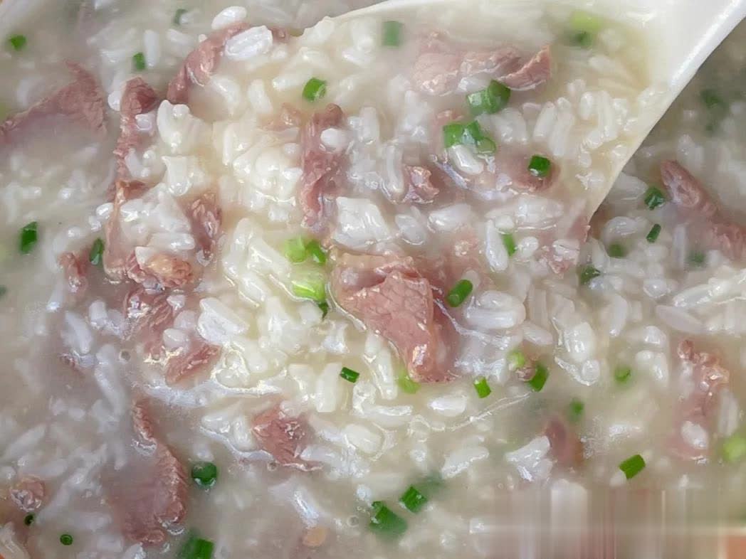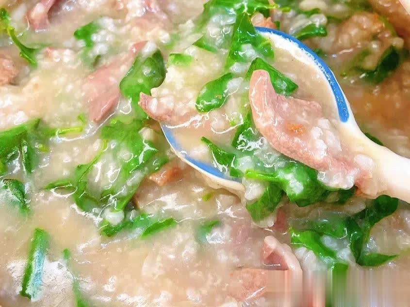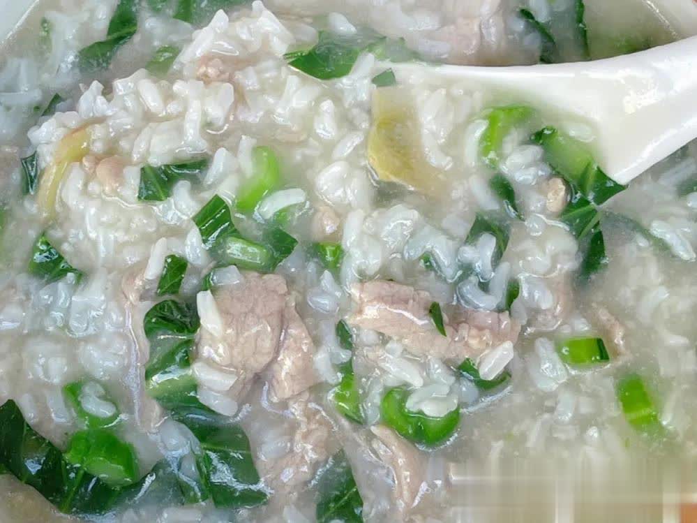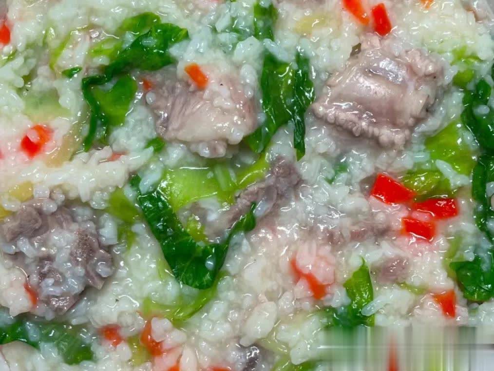 3.大火煮开以后,转中小火炖煮至大米开花,再把腌制好的瘦肉放入,继续煮三分钟煮熟,然后倒入菜心滑散,继续煮一分钟煮熟。