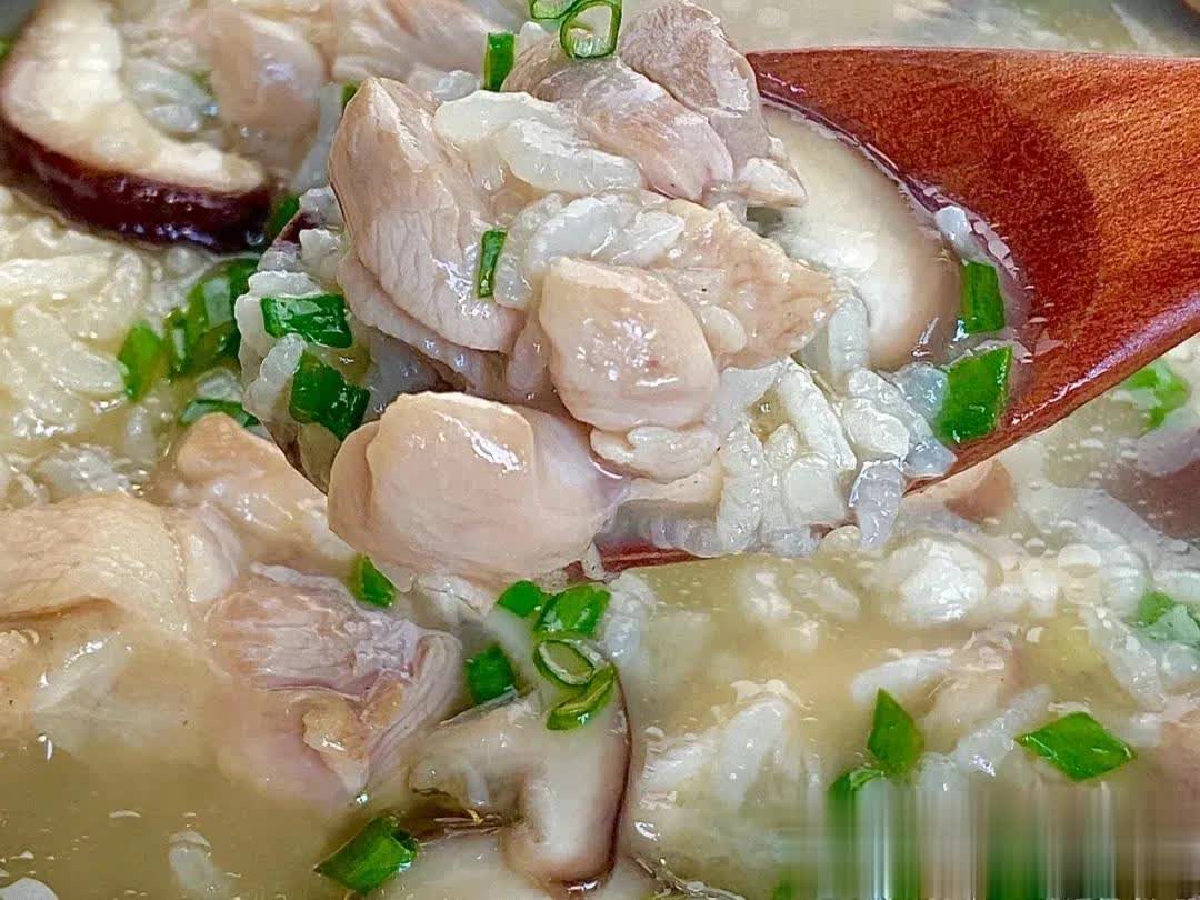 3.煮开大米后,清洗干净香菇,然后和腌制好的鸡腿肉一起放入粥中炖煮,再煮15分钟左右后,加入适量的食盐和白胡椒粉调味提鲜。