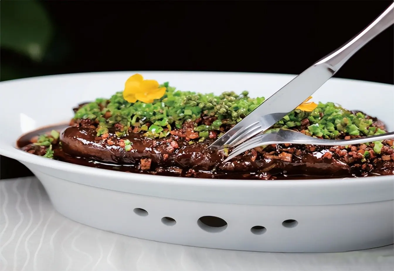 2.锅烧热,加入煨海参汤汁半炒勺,放入黄玉参,加鸡饭老抽调色,调入少许味精、鸡精、白糖,收浓亮汁上色,把黄玉参盛在盘中,腹面向上,装上肉臊子,浇上收黄玉参的汁水。