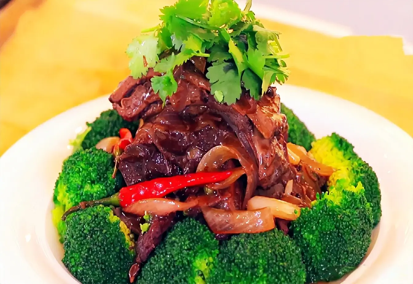 8.西兰花,花朝外,梗朝内,摆成一个空心圆,将炖煮好的鹿排叠起来放在中间。