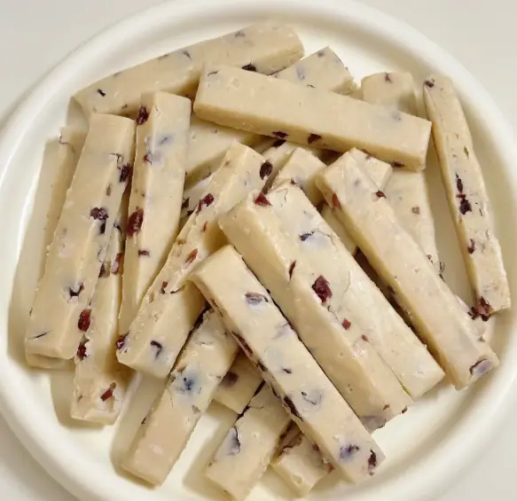 此时将其从容器中轻轻提出,揭去保鲜膜,放在案板上,切成粗细均匀的条状,这便是奶条的雏形了。切好的奶条可以依据个人喜好,在不同风味的奶粉中轻轻翻滚,使其周身均匀地裹上一层细腻的粉末,这不仅能防粘,更能增添一层丰富的口感与视觉美感。至此,一份自制的河南风味酸奶奶条便基本完成了。