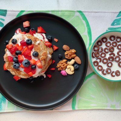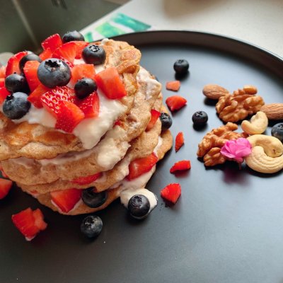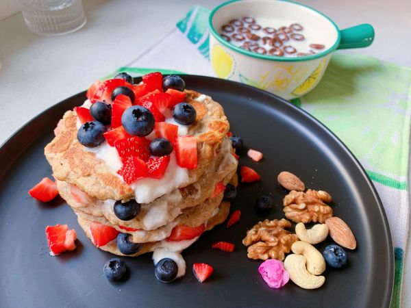 1、香蕉最后用熟透的。一是混合时比较好操作,二是成熟的香蕉做出来会有香蕉的香气。 2、如果嫌麻烦蛋白可以不打发,直接搅拌到面糊里。 3、火候的掌握,不管用什么锅最好用小火,然后盖盖子焖着加热,这样方便两边都成熟。 4、水果可以任意放,不用必须放草莓、蓝莓。但是如果减肥就要注意了,不要放高糖的水果了。 5、没有黑全麦粉可以用全麦粉代替,如果不减肥还可以用小麦粉,都是随意的随自己心情。 6、减肥期间可以吃坚果,但是要注意量,不要多吃,每天几颗补充优质脂肪。