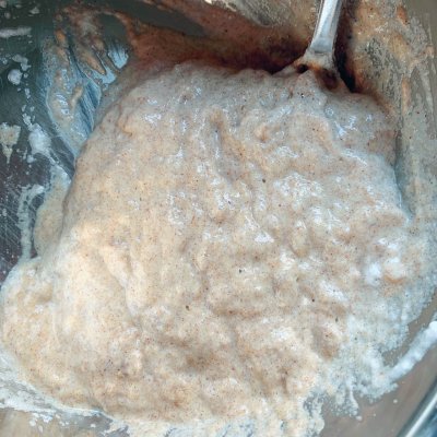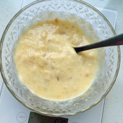 步骤5、一个鸡蛋清打发至发白能立住后,将刚才的鸡蛋酸奶香蕉面粉混合物与其混合。如果不想打发蛋白,也可以在上两步将蛋白直接与蛋黄搅拌到糊糊内。打发可以让做好的饼更松软些。