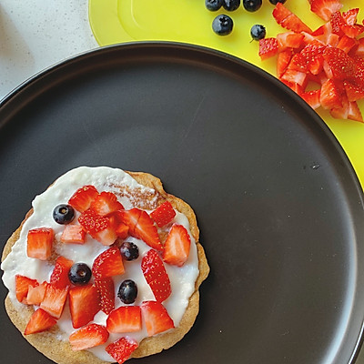 步骤8、上述材料一共摊了五张小饼。将它们叠到一起,内层中间放上自制酸奶和切碎的草莓、蓝莓。
