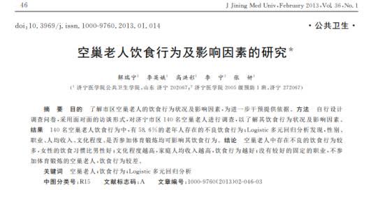 [1]解瑞宁,李英娥,高洪彩,等.空巢老人饮食行为及影响因素的研究[J].济宁医学院学报,2013,36(01):46-48.