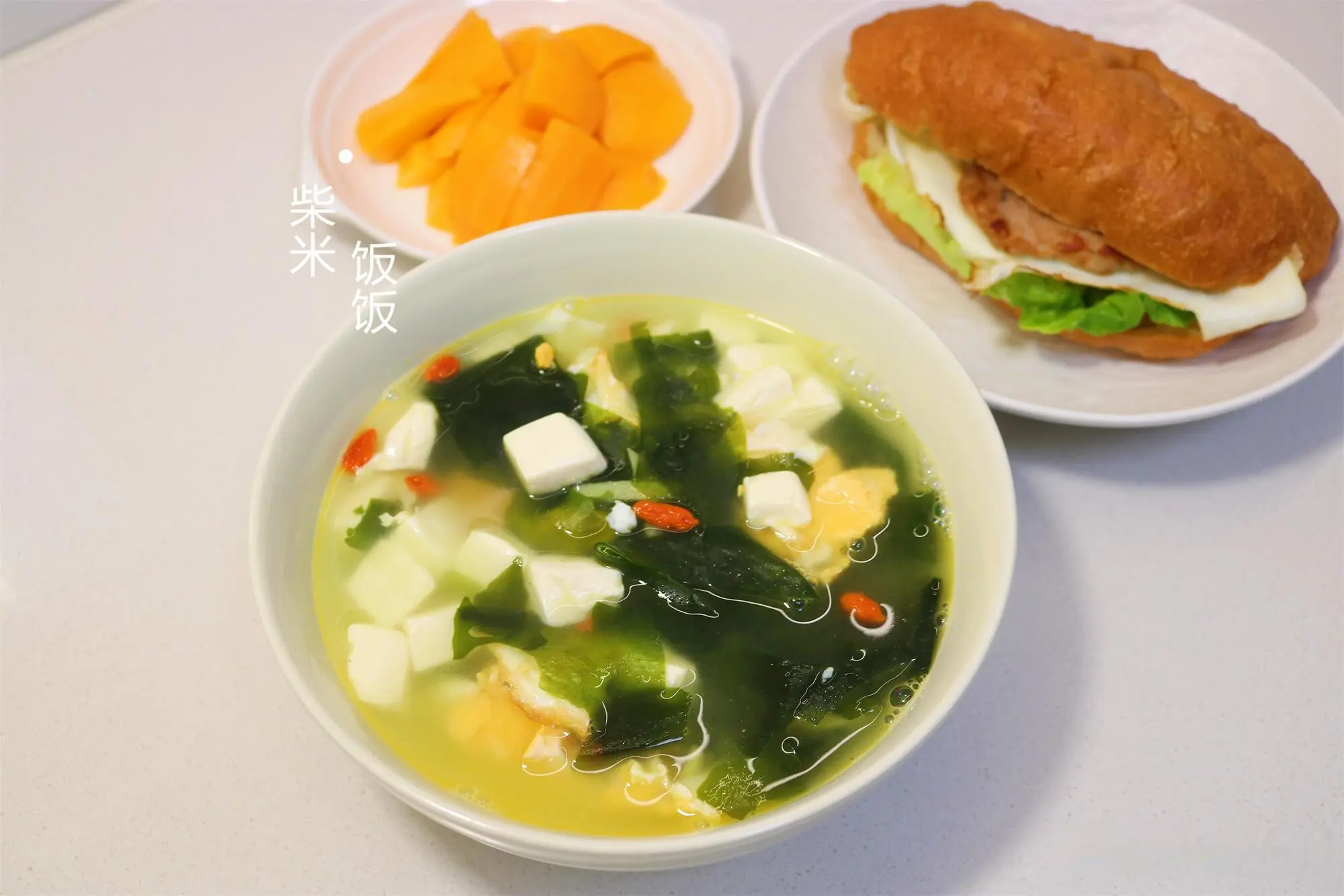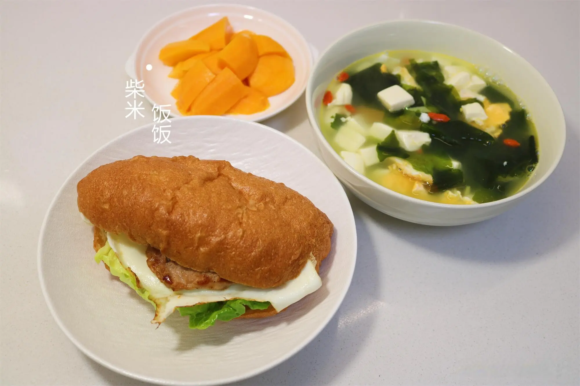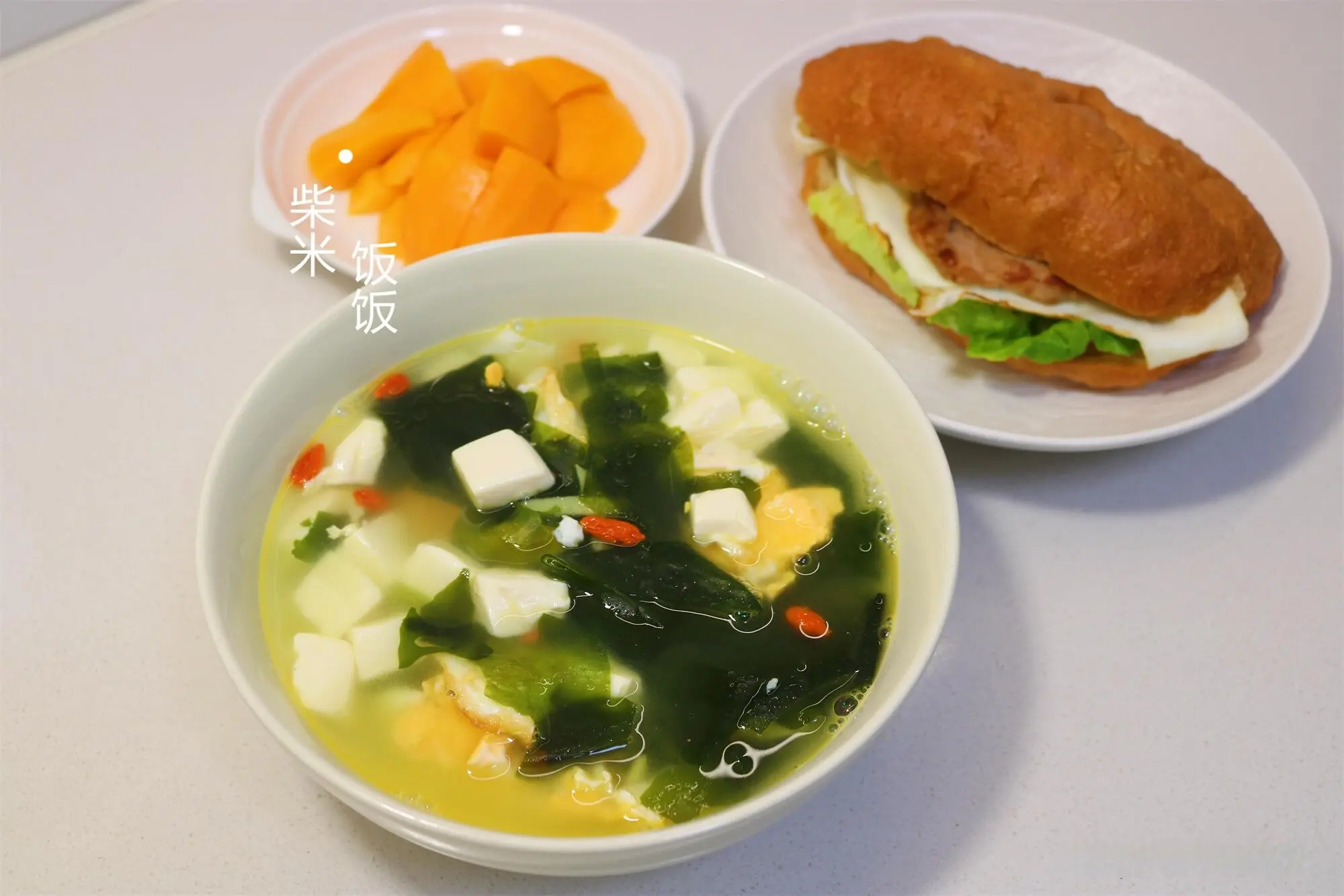 一个肉蛋恰巴塔面包,一碗裙带豆腐汤,两个锅一起做,十分钟就可以端上桌。有汤有主食,食材丰富,营养满满又好吃。