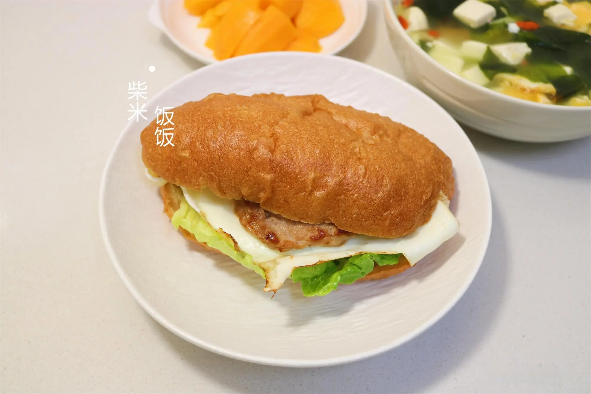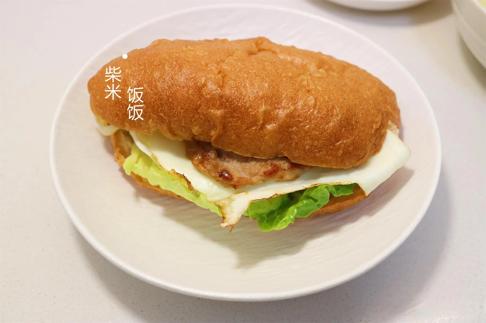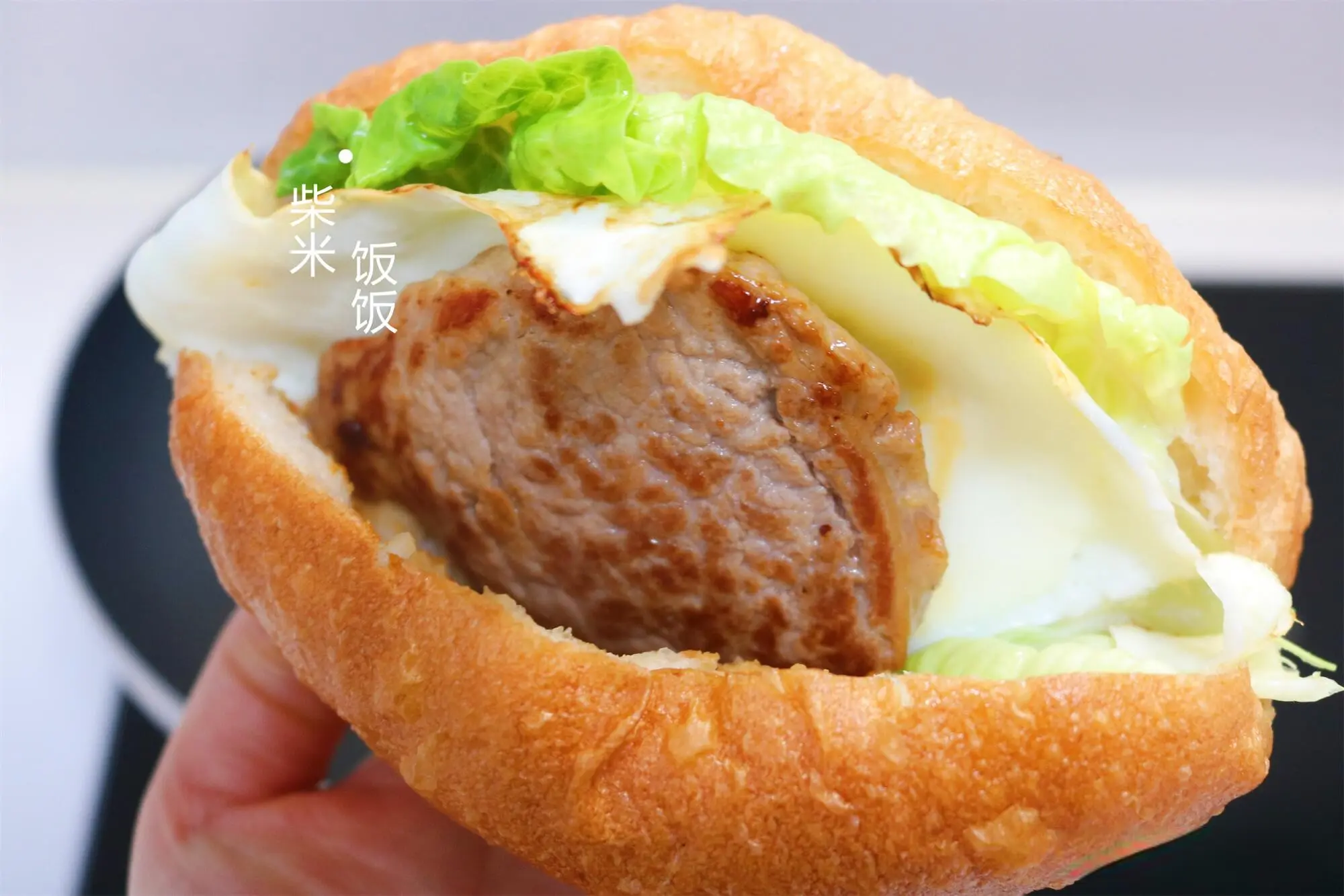 4,我还煎了一块自己腌制的里脊肉,根据自己的喜欢,可以挤点番茄酱、沙拉酱啥的。这个面包香软筋道,有肉有菜,很适合早餐吃。