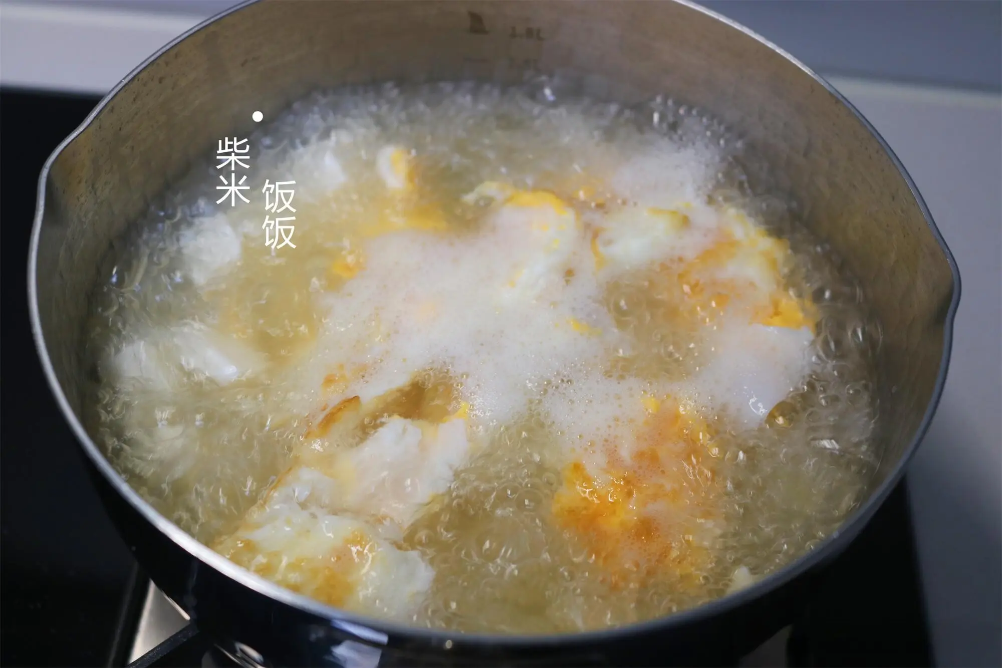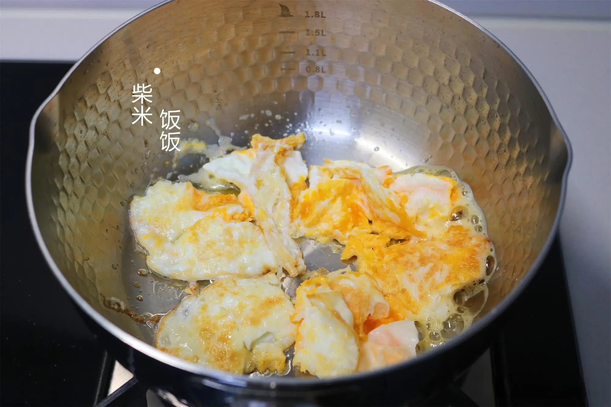 5,另外再煮个汤。热锅凉油,打入两个鸡蛋,煎到一面定型翻面,再用铲子铲成小块。