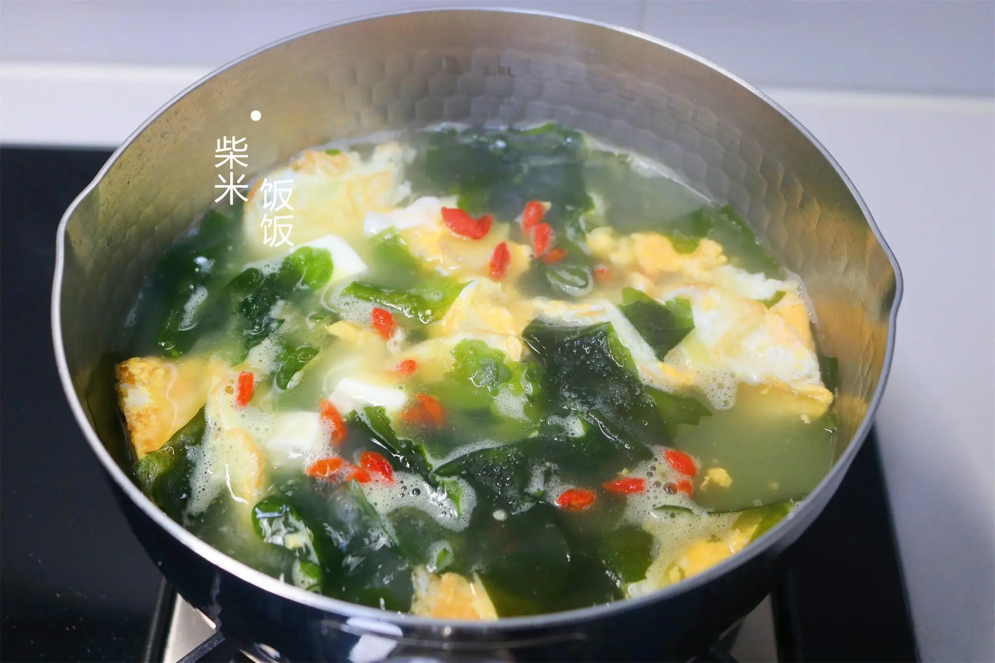 7,接下来放入泡发的裙带菜,大火煮开。然后加盐、胡椒粉、松茸调味料、枸杞调味,这个汤就好了。