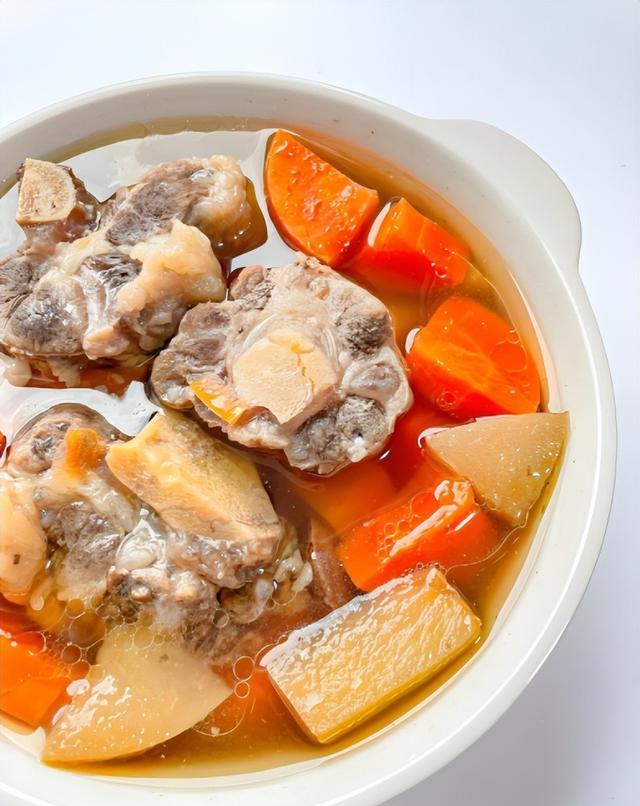 7. 完成并盛出:当汤炖煮至浓郁,牛尾骨肉质酥烂时,取出姜片和葱段,捞出牛尾骨,将汤盛出。可以根据个人口味,再加入一些新鲜的香菜点缀,增加风味。