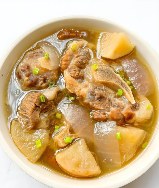 4. 加入苹果和瑶柱:牛尾骨炖至软嫩后,加入切好的苹果块和瑶柱(如果使用)。继续用小火炖煮1小时,苹果的酸甜味会渗透到汤里,增添汤的鲜美口感。