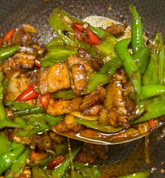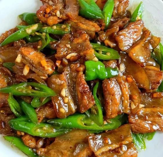 锅底留点猪油,下蒜片、姜丝爆香,放入切好的螺丝椒或线椒,大火翻炒断生,再把肉倒回去,加一点点盐和生抽翻匀出锅。