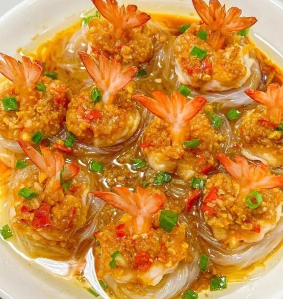 这道菜是典型的“伪高端”菜。端上桌盘子周边摆着一圈红色的虾,中间是吸满汤汁的粉丝,看着像大酒店几百块的招牌菜,其实做法简单到离谱。