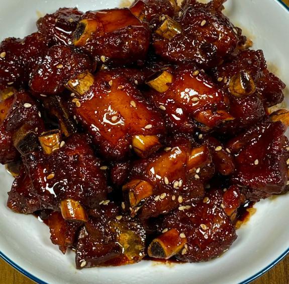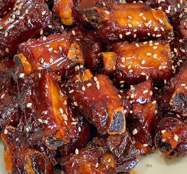 锅中少留底油,倒进糖醋汁熬至冒大泡黏稠,倒入炸好的排骨快速翻炒,让糖醋汁均匀包裹住每一块排骨,撒点白芝麻出锅,外酥里嫩,酸甜适口。