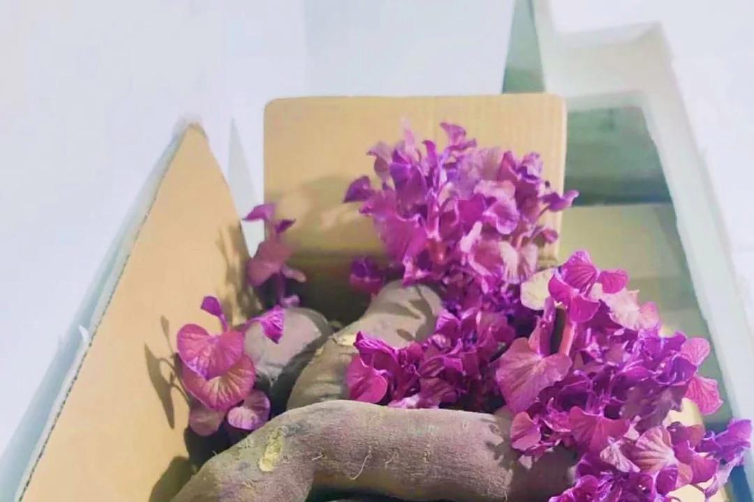 在外的时间,几乎都把它忘记了,回家打开地下室,没想到这一箱子紫薯“成了精”,长出很多花一样的新芽。
