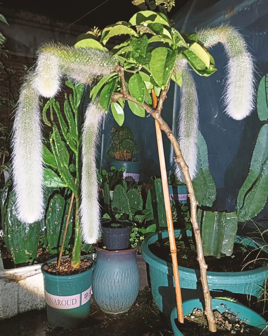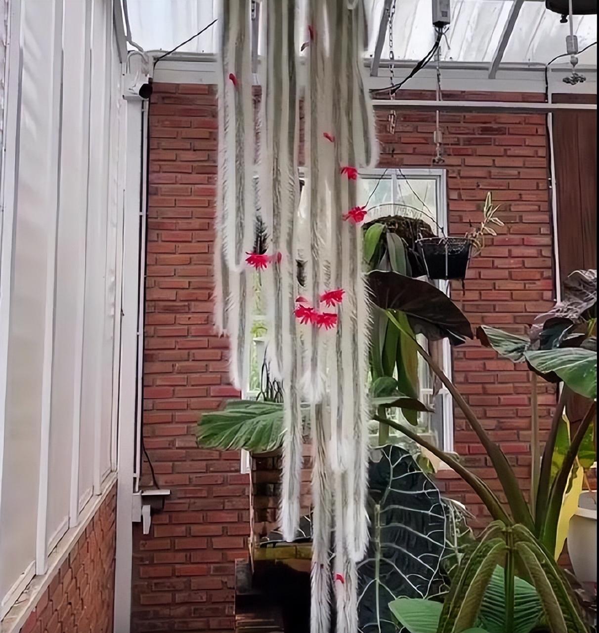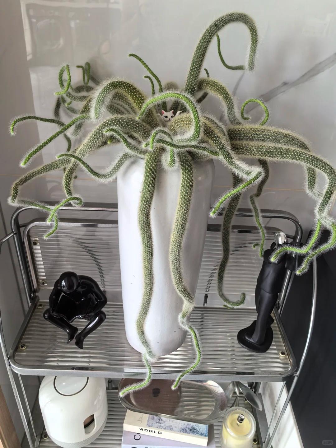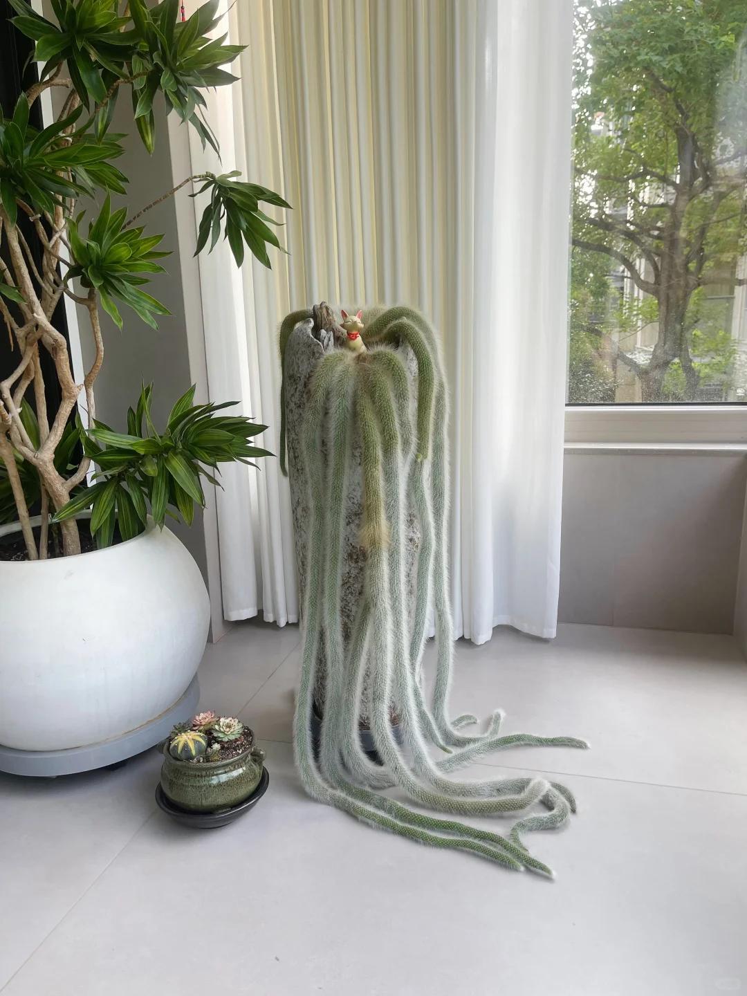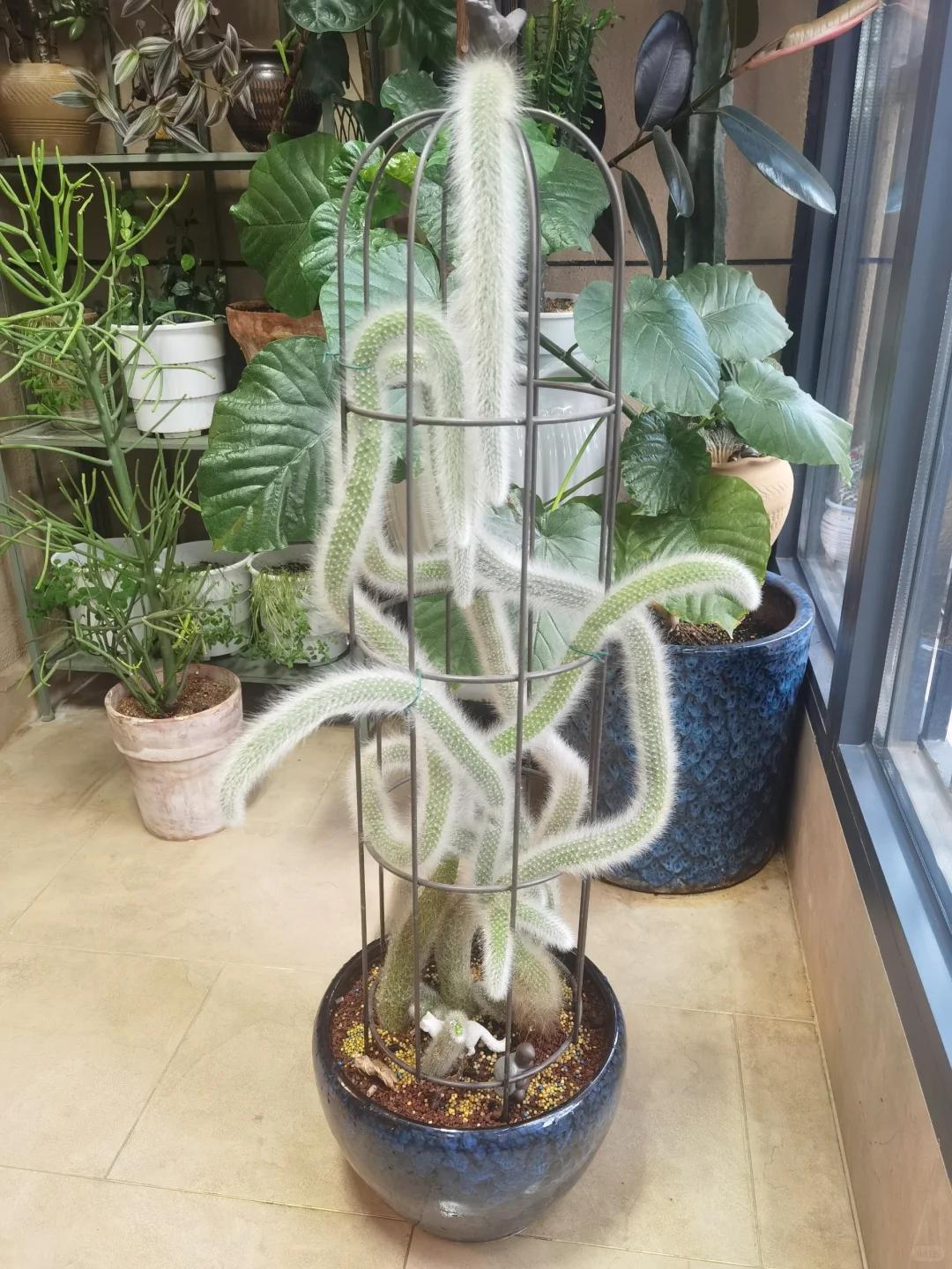 夏天阳光强烈,他会给九尾狐遮阴;冬天温度低,就把它搬进屋里保暖。现在这盆九尾狐越长越壮,直径快半米了。
