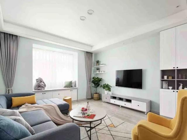 沙发背景以豆绿色天蓝,淡蓝粉撞色风进行粉刷,自然清新。选择了成品电视柜与装饰书架,让空间看起来更加休闲开阔。