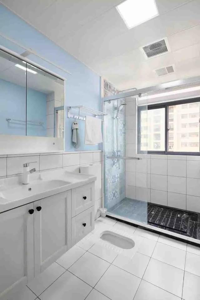 卫生间做了干湿分离,将干区外移后,卫生间内部的空间比较宽敞,便将洗衣机安置在这里。后方的墙上还做了吊柜,增加收纳让这个小空间变得更加整洁有序。’