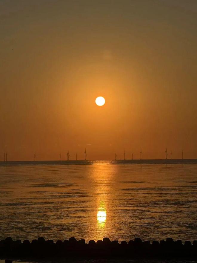 当天边第一缕阳光洒下来,整片海面波光粼粼,滩涂上的水洼也闪着碎钻一样的光。