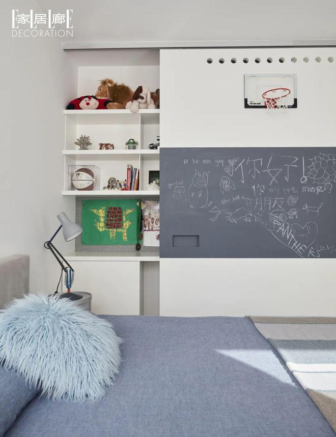 儿子卧室内,可滑动面板上特别设计了篮球架,