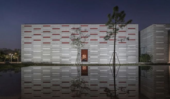 白色混凝土块与镶嵌釉面红砖,形成富有层次感的立面肌理。