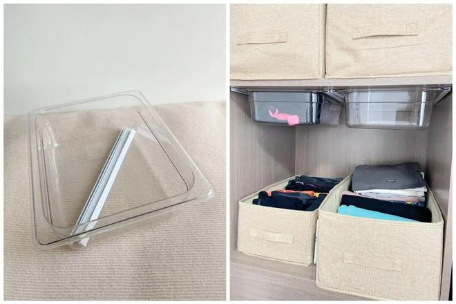 3)包边条+托盘盒,安装在柜子隔层顶部,就变成了一个灵活的小抽屉,一些零零散散的小物品都可以放进去收纳。