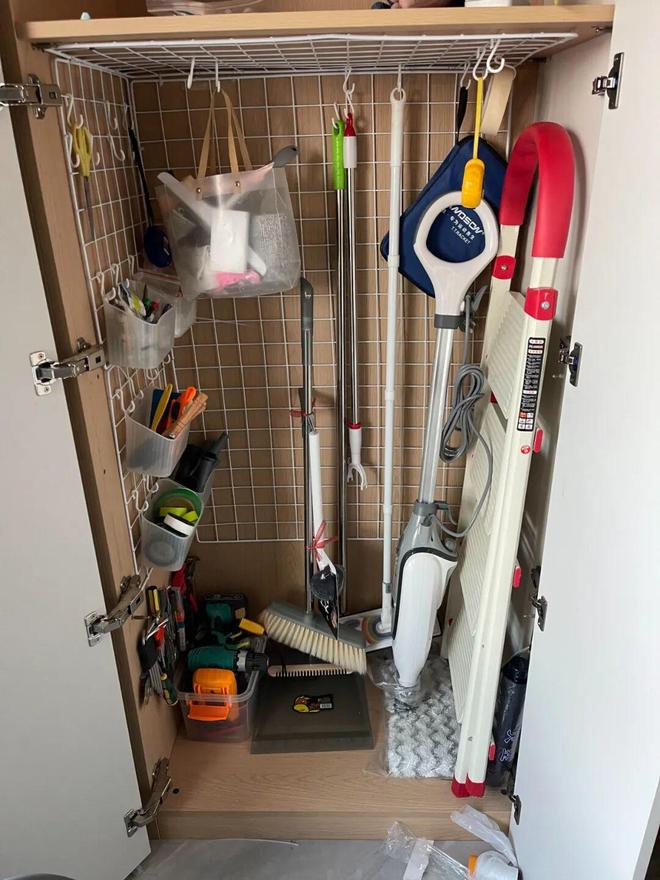 1)将网格片安装在工具柜里,再搭配上一些挂钩,收纳力立马翻倍,比用洞洞板要便宜多了。