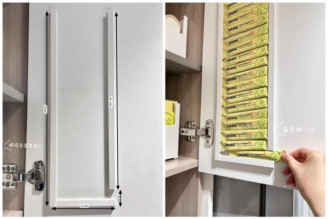2)按照U形的结构将包边条贴在柜门背面,下方再留一个小口子,就可以收纳各种条状包装的饮品了,并且一抽就自动掉下来。