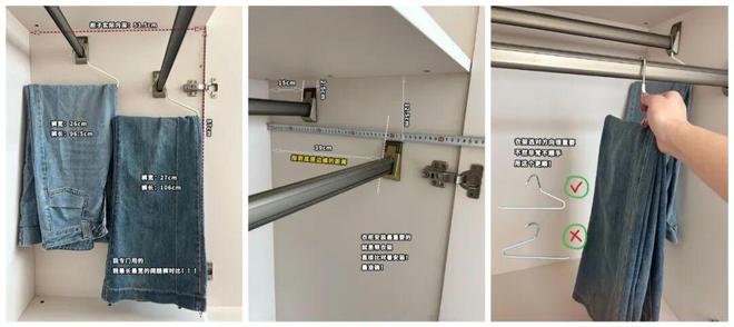 1)双排裤架:挂衣杆上下错开10cm,内外间距15cm安装,搭配上25cm长的鹅型衣架,可以实现双倍收纳。