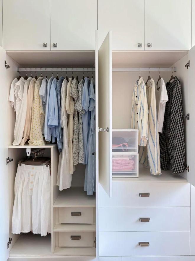 衣柜作为卧室里的“核心收纳区”,一丁点的空间都不应该被浪费。如果你家的衣柜空间比较紧张,不妨试试“错层收纳”。