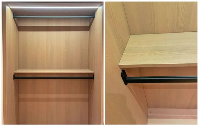 2)隔板内缩:上下挂衣区,可以在中间加一块内缩隔板,尺寸以挂衣杆为主并内缩2cm,方便后期收纳一些换季的衣物。