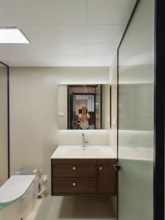其实,在洗漱区和马桶区挨在一起的情况下,镜柜完全可以做满墙设计,既能提升收纳力,也能放大空间感。