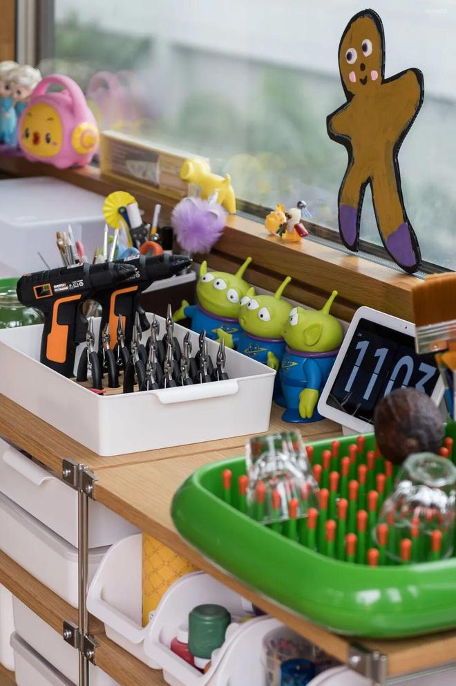 在广州这个手工爱好者的家里,阁楼旁的鸡肋小空间被改造成了手工坊,成为了屋主最爱呆的地方。桌面摆放着缝纫机,利用桌子侧面空间做了收纳架,小配件分门别类标记,被整齐收纳进一个个透明小抽屉里,窗台陈设架上的每一个细节都透露出屋主对手作的热情和对生活的品味。