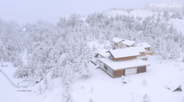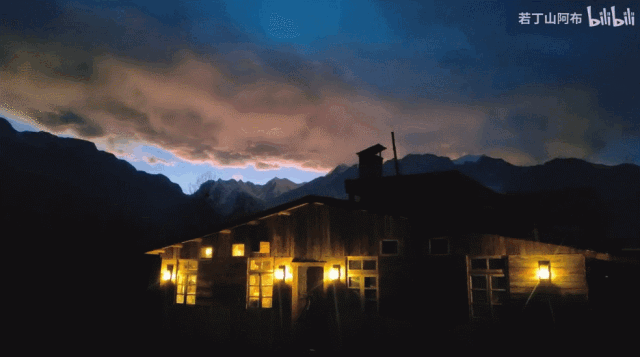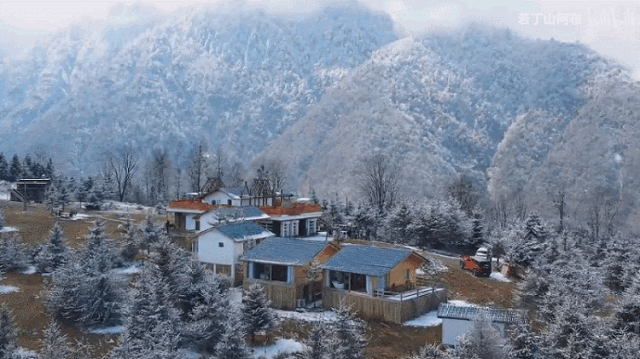 夜幕中,温暖的小木屋亮起暖黄的灯光,顶着闪烁的星空,勾勒出一张张明信片上的画面。