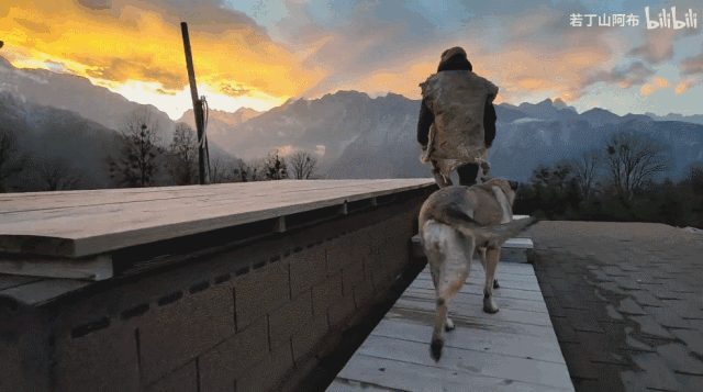 他带着狗狗爬上山顶,迎着雪山的注视,荡上几个秋千;