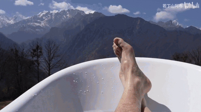 晴天,把浴缸抬到屋顶,在阳光的照耀下,对着雪山泡个澡;