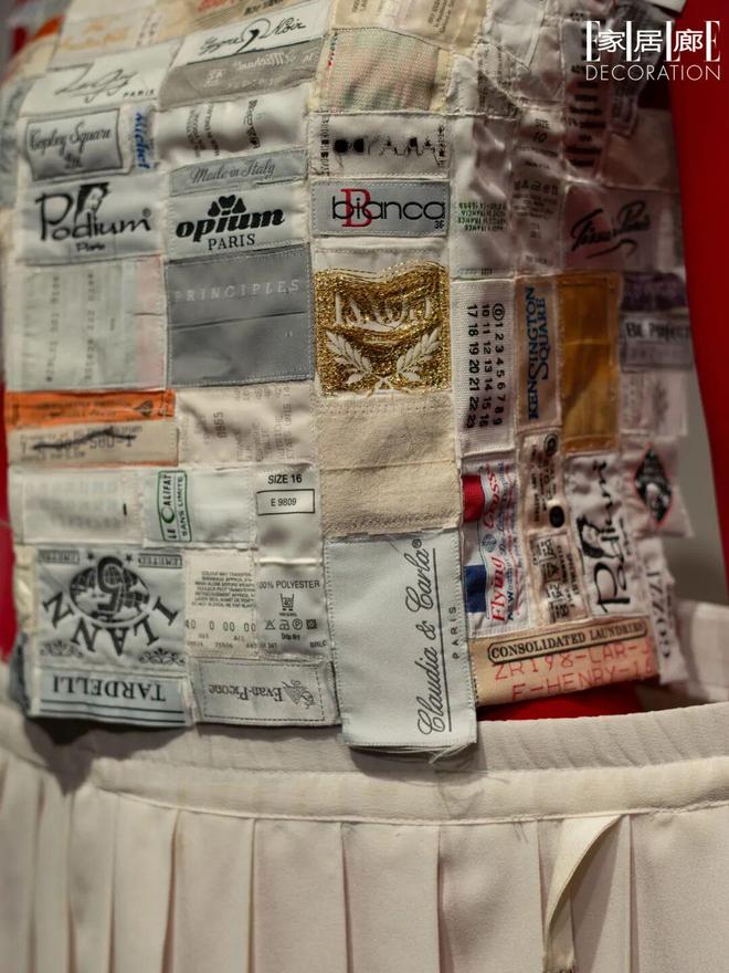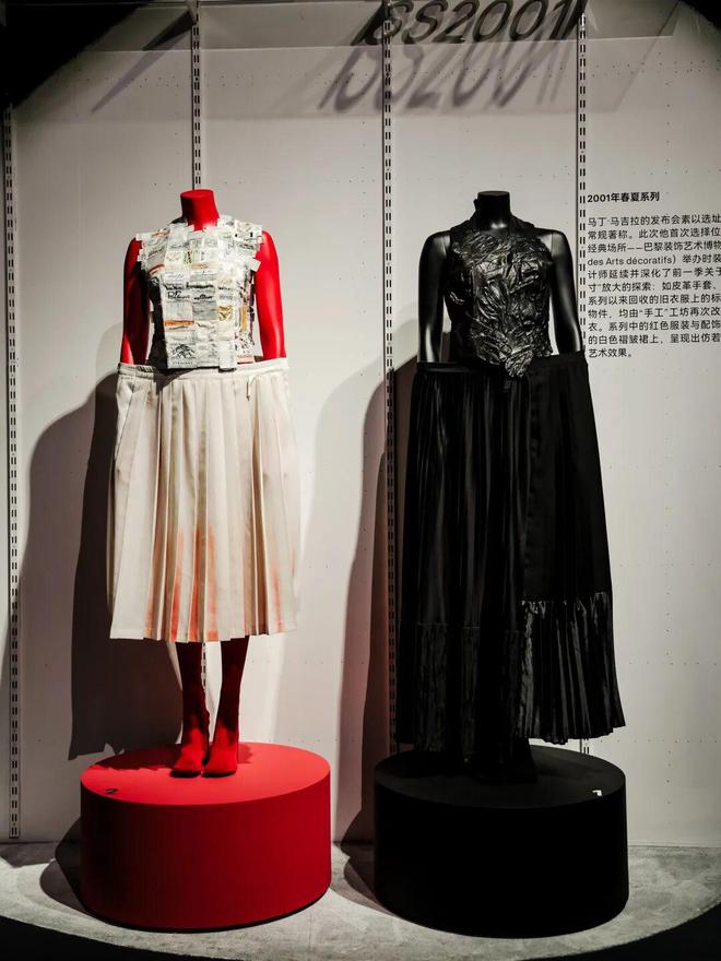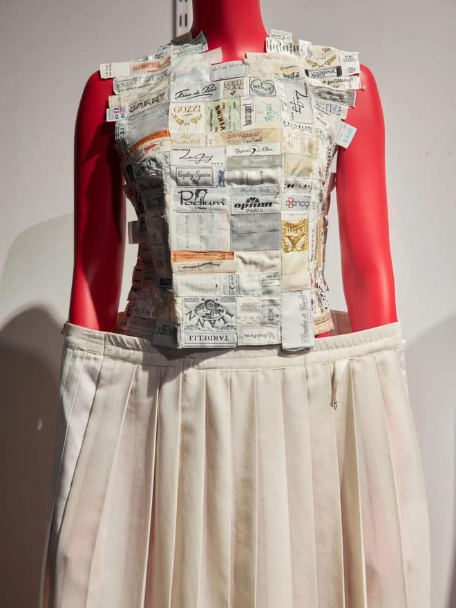 这种思路也贯穿在展览的布置里。展陈设计师Ania在天目里园区散步时,随手采来几枝杭州本地植物,把它们点缀在1993年春夏的戏服系列中,成了最自然的装饰。而在2001年春夏系列中,Margiela本人则通过将一件红色服装套在放大的白色百褶裙内,制造出仿若褪色的错视效果(Trompe l’oeil),将解构的视觉语言进一步延伸。