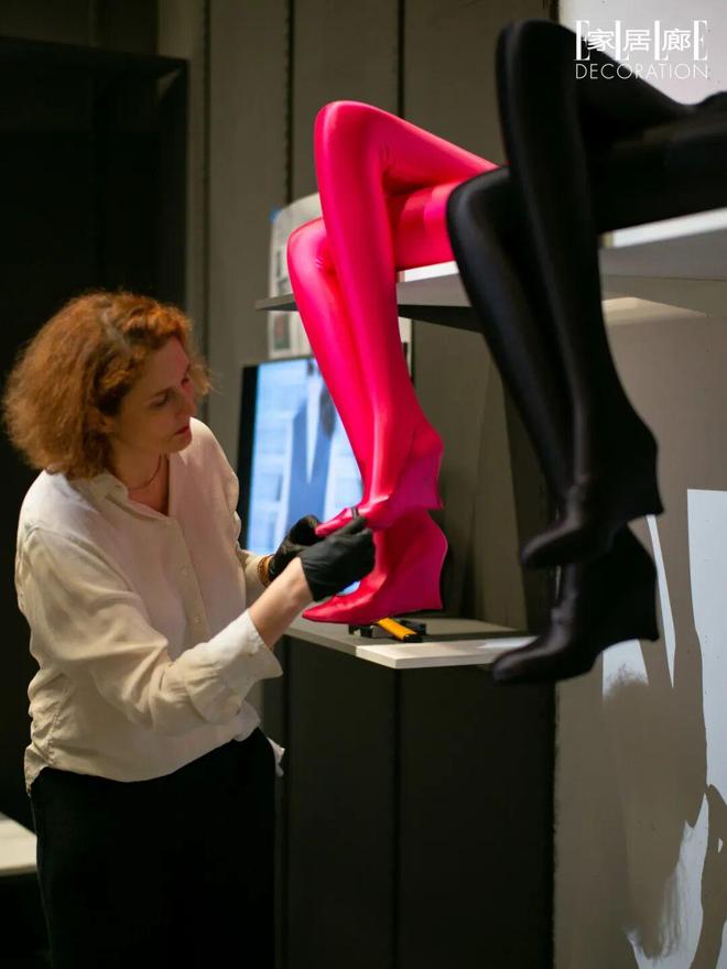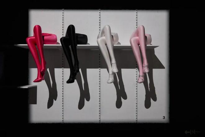 这种探索从未停下。2003年春夏系列中,模特们身穿亮面莱卡舞袜与上世纪80年代的鞋履,走下巴黎夏约宫剧院(Théâtre de Chaillot)的大理石阶梯。细节处的粉笔线,精确地勾勒出身体与服装的关系。为了还原这一瞬间,展览设计师Ania将展架抬高,只留下模特腿部的特写。视线被迫聚焦于局部,舞袜与鞋履意外成为主角。身体的局部被放大,反而呈现出一种安静却有力的姿态。
