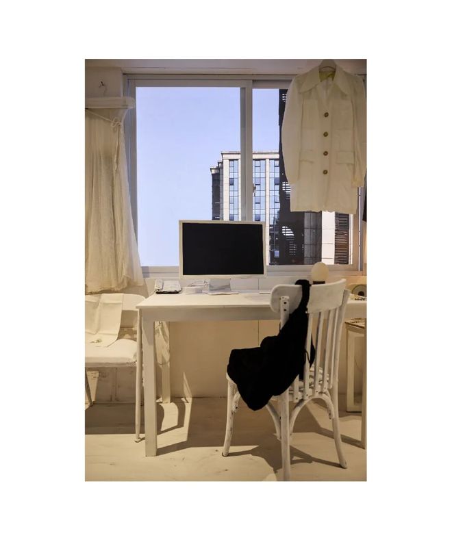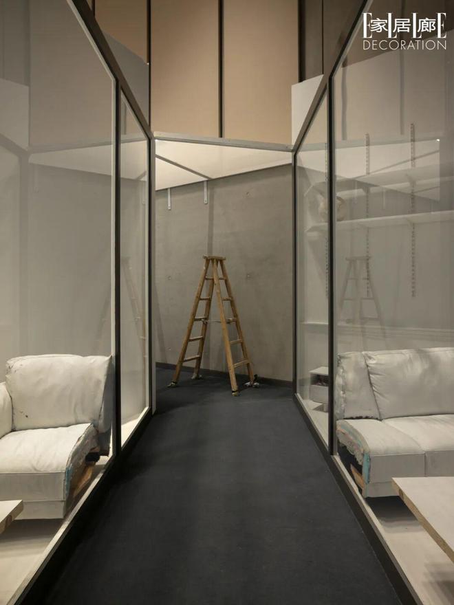 目里空间本身是一座极简而当代的建筑,而展览空间内部却呈现“真实”的工地状态:裸露的细木工板、带有痕迹的墙壁、粗粝的材质处理。这种反差并非偶然,而是Margiela式创作方法论的延续。