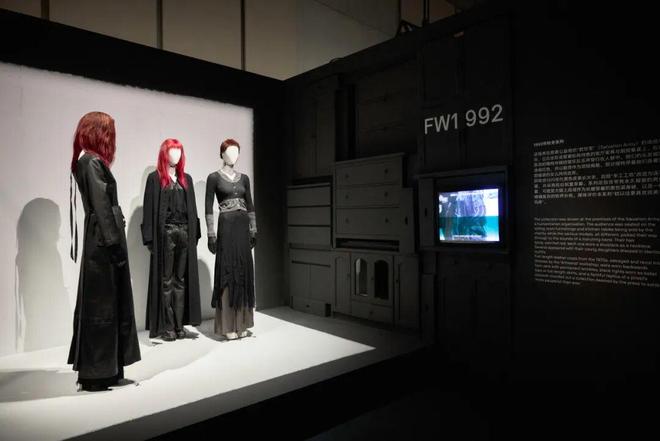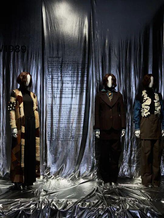 同年秋冬系列的发布场地选于“救世军”(Salvation Army),观众席就设置在机构本身待售的日常家具之间。为忠实还原当年的秀场视角,展陈设计师Ania与团队特意从杭州的二手市场淘来旧家具,将其统一做涂黑处理并进行堆叠陈列。这些被重新塑造的家具与空间中同步播放的当年秀场影像彼此呼应:静态的堆叠结构与动态的历史画面交织,共同激活了整个空间的记忆,引领观众穿越时空,于黑暗中重温Martin Margiela的昔日创作。