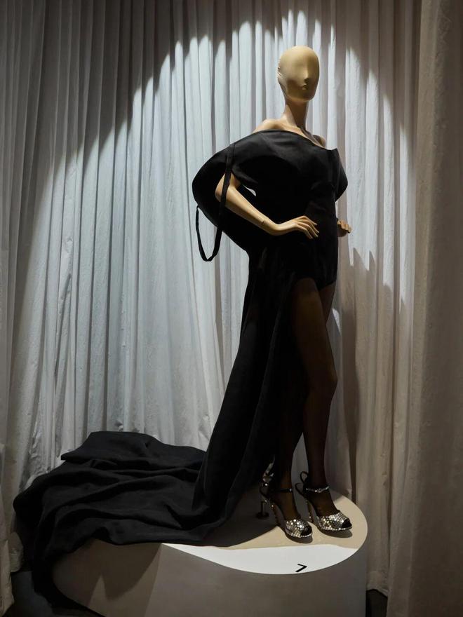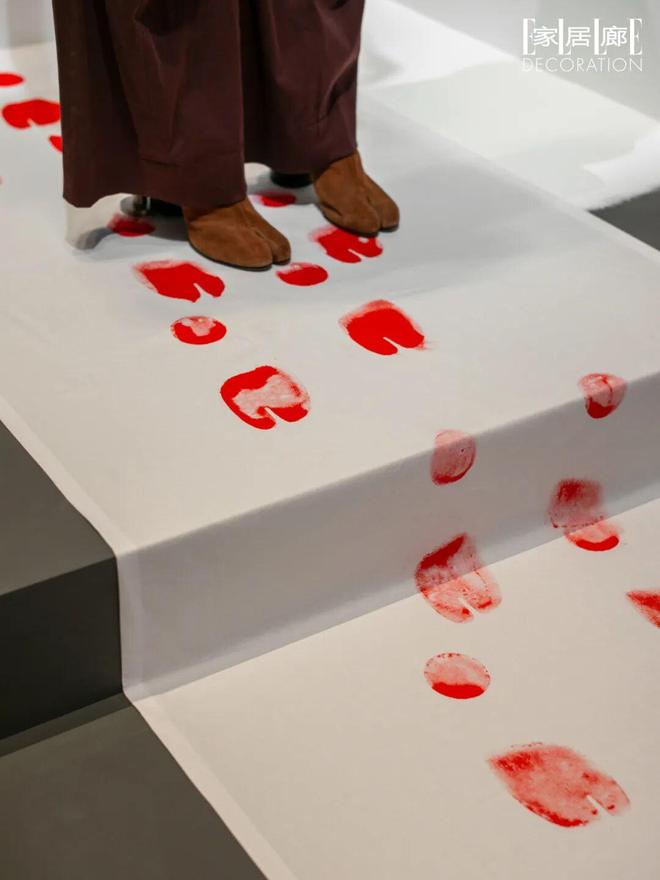 将时间拉回1989年10月23日的巴黎咖啡馆,Margiela首秀的红色分趾靴足迹跨越时间,步入目里空间——曾作为Martin Margiela模特的展陈设计师Ania,以布展者身份重访旧日记忆,用轨迹完成一场跨越三十余年的对话。墙面上跃动的秀场影像与背景声中不断回响的名字“Martin Margiela”彼此交织,没有品牌符号,只有一个被时间淬炼的名字。
